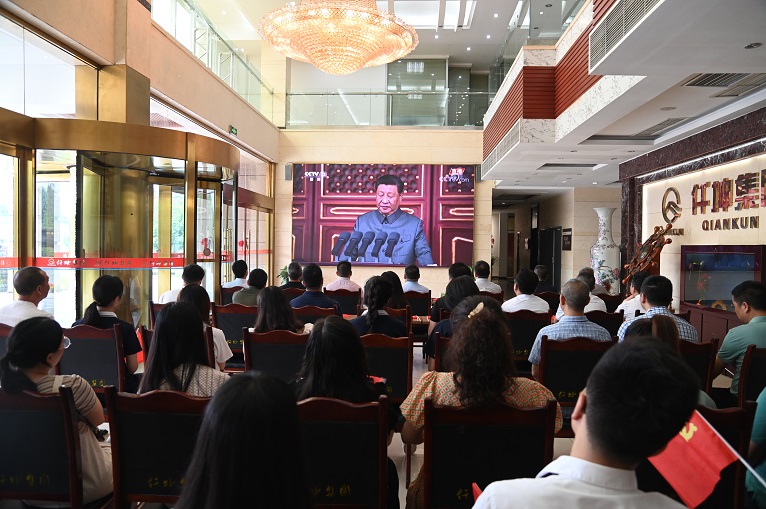 集團董事長謝世千、集團總裁謝澤波,及集團領(lǐng)導(dǎo)層,帶領(lǐng)集團部分黨員、職工代表在集團一樓大廳觀看了大會的盛況,感受中國共產(chǎn)黨百年輝煌奮斗史,聆聽習(xí)近平總書記重要講話,奮進新征程。