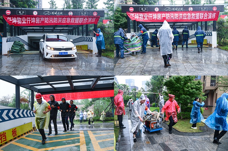 啟動儀式結束后,防汛防洪應急演練正式展開。此次演練以模擬地下車庫進水為場景,全面檢驗了仟坤物業(yè)的防汛準備和應急響應能力。面對模擬的暴雨天氣導致的地下車庫積水,仟坤物業(yè)的防汛應急小組迅速啟動預案,警戒組迅速設置警戒線確保車庫安全,疏散組通過廣播、電話等方式及時通知車主并引導他們有序撤離,同時協(xié)助無法及時駛出的車輛進行緊急撤離。搶險組則迅速運用防汛擋板、沙袋等物資對車庫出入口進行臨時封堵,并啟動移動式抽水泵等設備,快速有效地排除了車庫內的積水。最后,消殺組進入車庫進行全面徹底的消殺工作,以防止因積水引發(fā)的細菌滋生和次生災害。